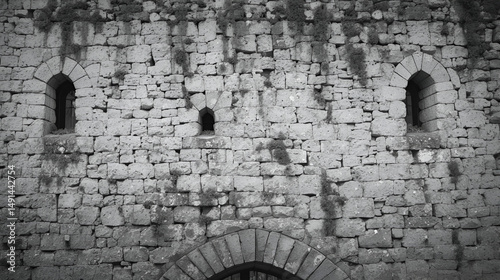 gray monochrone texture of an anciant old castle wall with little windows embrasures