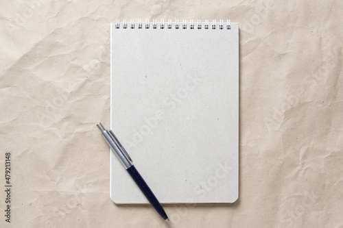 Gray notepad with white coiled spring and pen on a background of beige crumpled craft paper. With empty space for text and design