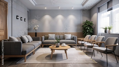 Gray sofa and wooden chairs blend seamlessly in a minimalist setting, joined by a low-profile coffee table, all amidst a soothing color palette and calming atmosphere.