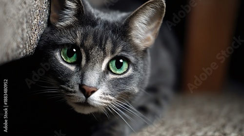 Gray tabby cat with vivid green eyes gazing intently, showcasing soft fur, whisker detail and calm, curious domestic presence in an indoor portrait with dark background