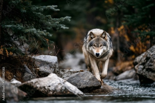 Gray wolf crossing rocky stream, wilderness terrain surrounding dense forest landscape with rugged natural environment