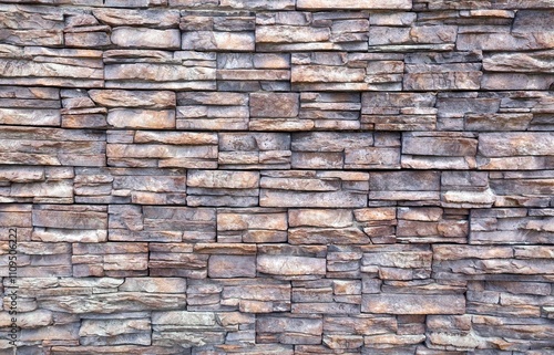 Grayish brown stone external wall covering wall made of irregular bricks of natural rocks. Background and texture.