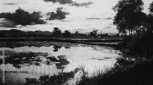 Grayscale landscape with reflective rice paddies under a cloudy sky at dusk