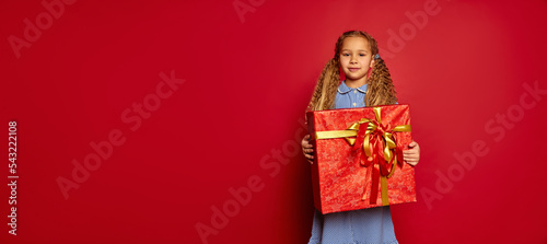 Great gift. Happy smiling little girl, child in casual outfit with box in festive package at holiday. Merry Christmas, New Year. Concept of emotions, dreams, birthday, happy childhood, wishes
