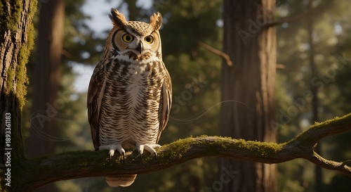 Great Horned Owl Perched on Mossy Branch in Forest.