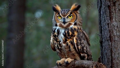 Great Horned Owl Sitting on Old Tree Branch at Dusk – Piercing Yellow Eyes Glowing, Twilight Forest Background