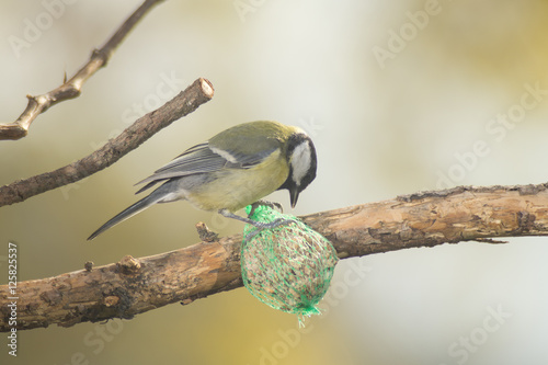 great tit, blue tit eats fat ball at the manger in the branches of trees