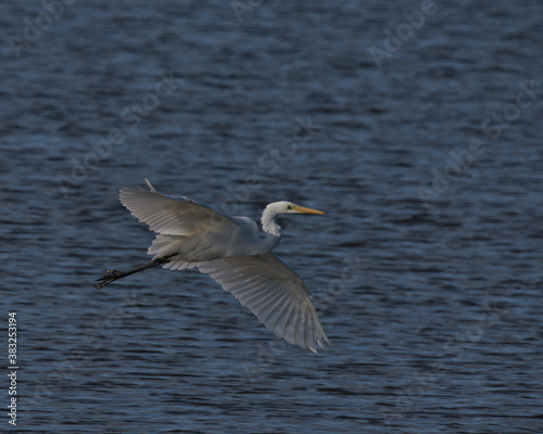 Great white egret , Ardea alba in flight over water.