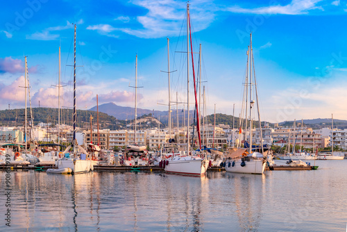 Greece. Rethymnon. Beautiful cityscape port, arsenal, modern buildings, yachts, azure sea water on the background of stormy sky at evening, harbor.