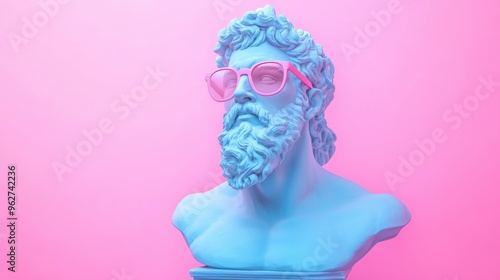 Greek blue bust with brutal god Zeus wearing rose colored glasses on pink pastel background with copy space.