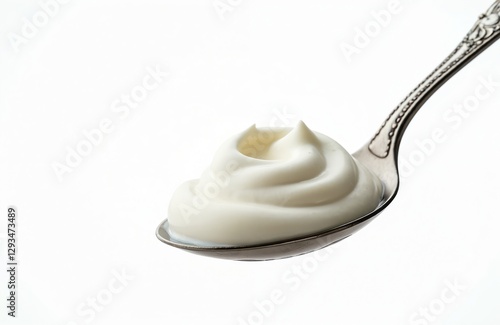 Greek yogurt portion on silver spoon isolated on white background. Healthy dairy product rich in protein and probiotics. Natural fresh creamy dessert for diet and nutrition.