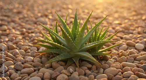 Green Aloe Vera Plant Growing Among Smooth Pebbles in a Natural Setting with Soft Sunshine