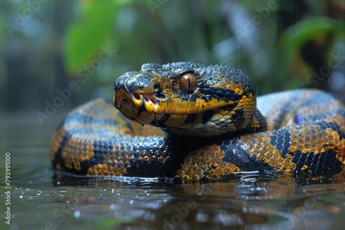 Green Anaconda: Coiled on riverbank with massive body, illustrating its role as apex predator.