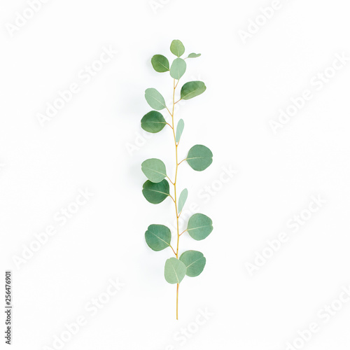 green branch with eucalyptus populus leaves on white background. lay flat, top view