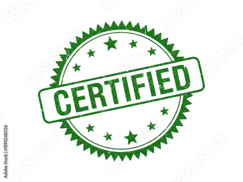 Green "CERTIFIED" grunge rubber stamp with a distinctive jagged edge background, signifying quality and approval.
