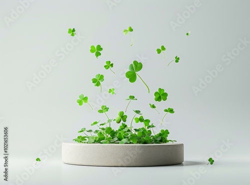 Green clovers floating up from a concrete podium against a white background