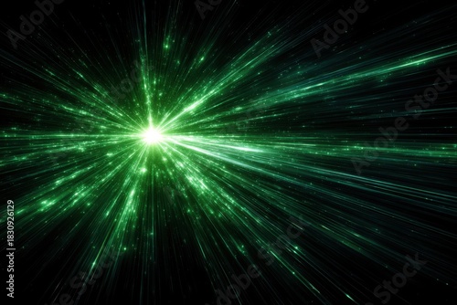 Green energy burst radiates from the center, creating a radiant, star-like cosmic explosion