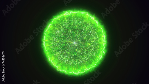 Green energy magic sphere round hi-tech light digital ball space planet star made of futuristic light rays lines and energy particles. Abstract background