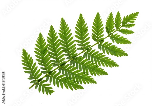 Green fern frond with detailed leaves isolated on white background, botanical illustration