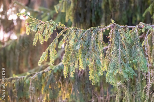Green fir branches in winter during at sunset