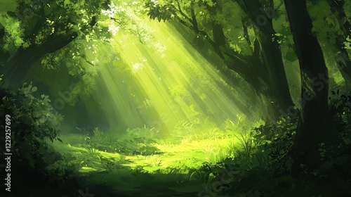 green forest with sunlight filtering through the dense canopy, creating a magical and refreshing atmosphere.