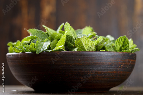 Green fresh mint om the wooden table