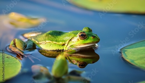 green frog resting on the water surface reflecting its vibrant colors in a tranquil pond in nature