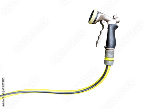 Green garden hose with spray head attachment
