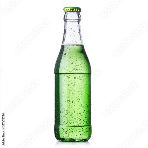 Green glass bottle of sparkling beverage on white background. Small bubbles visible throughout the liquid.