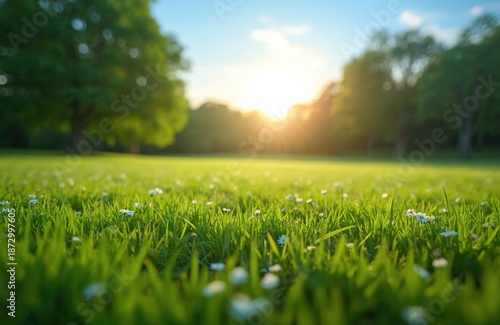 Green grass lawn with sun beams in background. Trees and blue sky are blurred. Perfect place for relax in summer nature. Flowers and grass closeup on meadow.