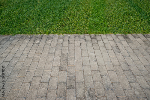 Green grass texture and herringbone brick tile floor walkway.