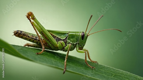 Green Grasshopper on Leaf - Macro Photography