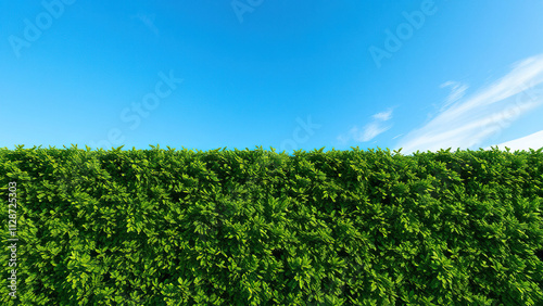 Green hedge leaves wall background with clear sky, verdant scene, garden wall