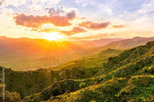 green highland mountain landscape of beutiful sunset or sunrise in greeen summer rural land