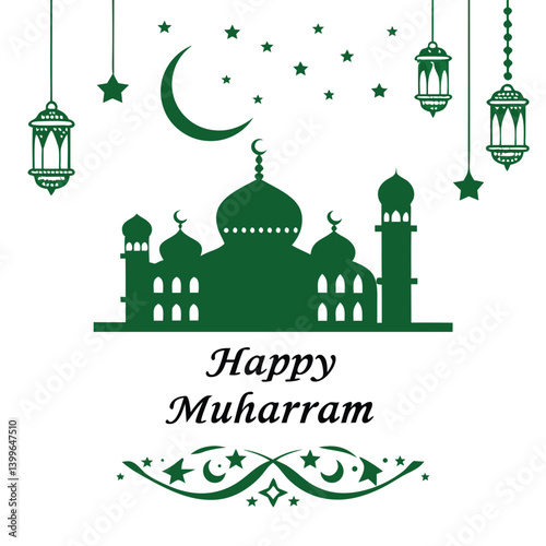 Green Islamic mosque silhouette for Muharram with crescent moon and lanterns on white background