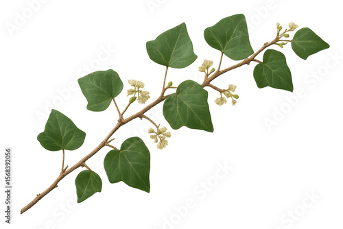 Green ivy twig displaying verdant foliage and delicate yellowish blossoms, isolated against transparent backdrop