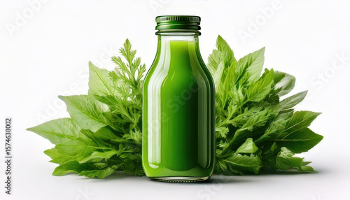 Green juice bottle with fresh leafy herbs and vegetables behind, symbolizing healthy detox beverage and natural wellness