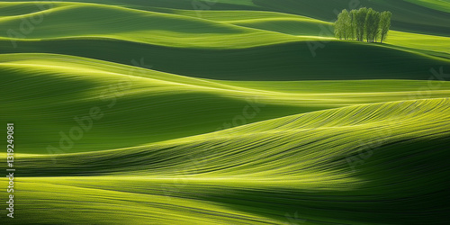Green landscape of rolling green fields, likely agricultural land, bathed in soft sunlight. The scene is characterized by its simplicity, natural beauty.