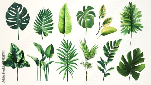 Green Leaf Collection: Artistic Watercolor and Detailed Digital Illustrations Featuring Clovers, Tropical Leaves, Falling Foliage, and Textured Dry Leaves - Perfect for Nature-Themed Designs and Decor