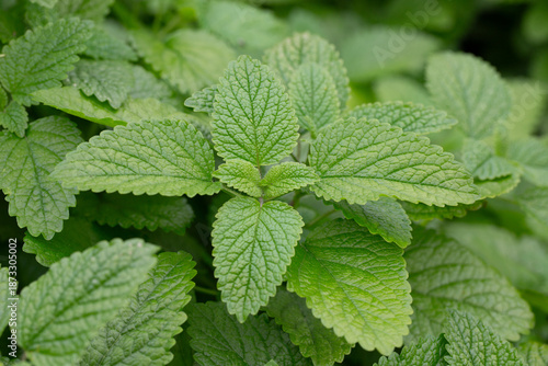 Green leaves of lemon balm melissa officinalis plant in the mint family. Close-up of young leaves of a medicinal plant in a garden.