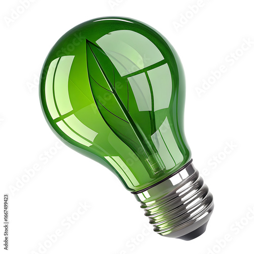 Green light bulb with leaf inside symbolizing eco friendly energy