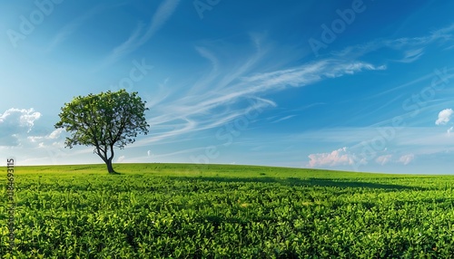 Green meadow and lonely tree on blue sky background. Nature composition.