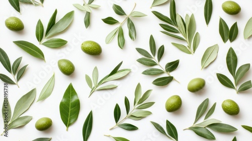 Green olives and leaves pattern on white.