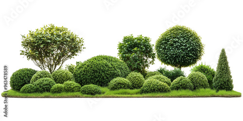 Green park view with trees, bushes, and grassy lawn on transparent background for landscape design