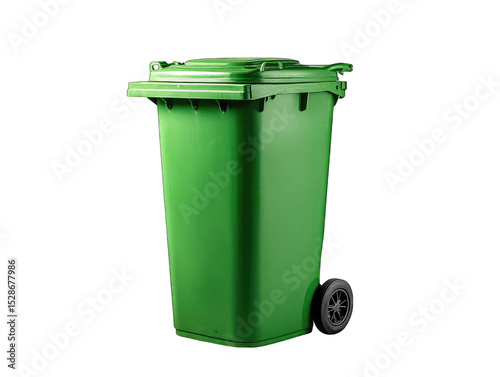 Green plastic garbage can on wheels