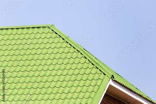 green roof on the house against the blue sky