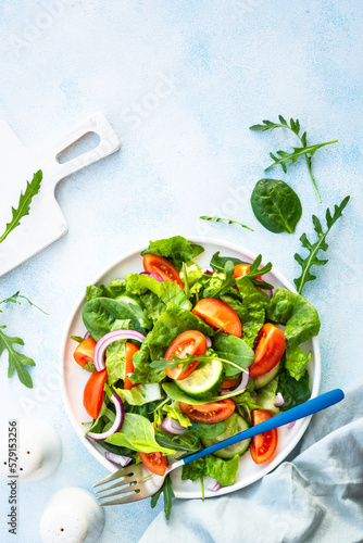 Green salad with leaves and vegetables. Top view at blue.