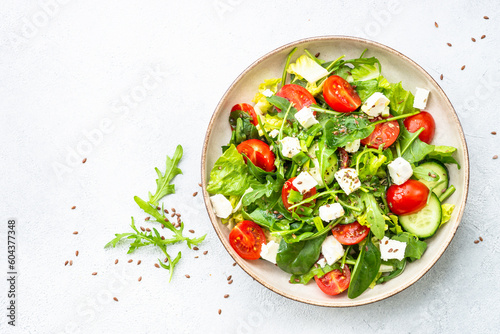 Green salad with spinach, arugula and tomatoes with olive oil. Top view on white.