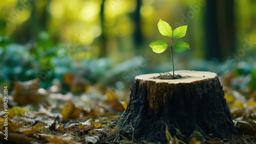 Green sapling growing out of a tree stump in a forest.