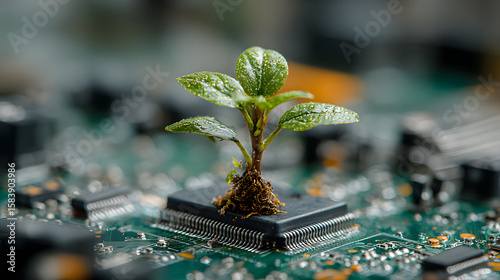 Green seedling sprouts from electronic circuit board